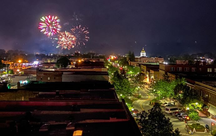 The fireworks extravaganza starts after dark on July 4th. They’ll be launched from the Brevard College campus, and the best spots to view them include Jailhouse Hill.