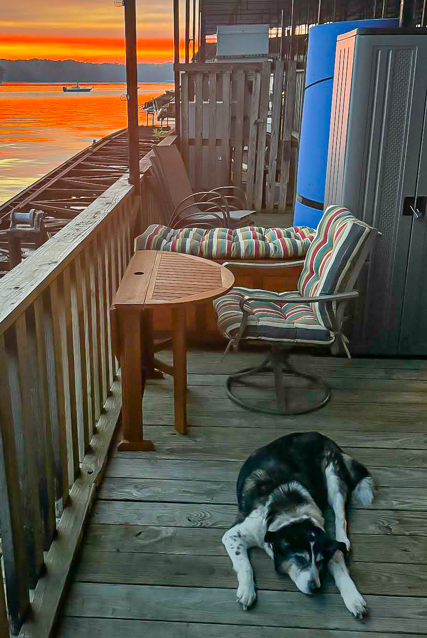 It was an amazing location close to Mary’s Aunt Judy, and we had a wonderful birthday dinner with the most incredible sunset. Unfortunately, we got home to find that Huckleberry had fallen on the slick vinyl flooring and couldn’t get up.