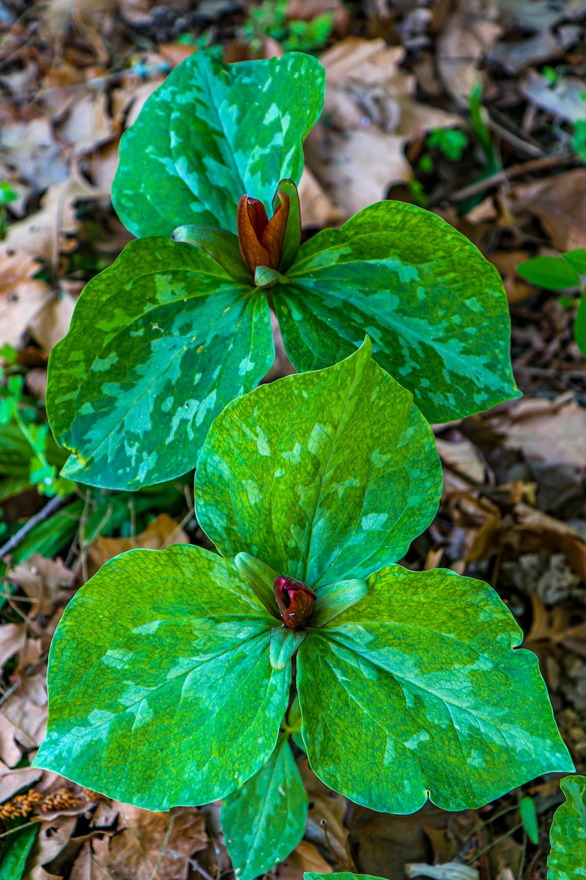 During our late April visit in 2023 we were treated to a Spring flush of Trilliums right as we entered the garden, with the beautiful buds just beginning to blossom.