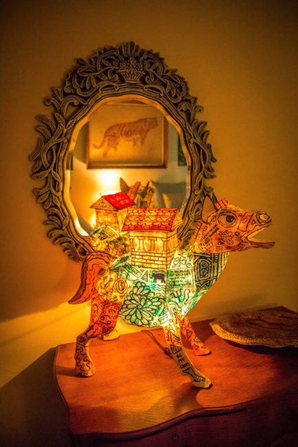 Owned by artists Claudia Dunaway and John Richards (whose home, gallery, and studios are also on the 10-acre property), the house is filled with colorful art, including hand-made dishes, tiles, lamps, and more.