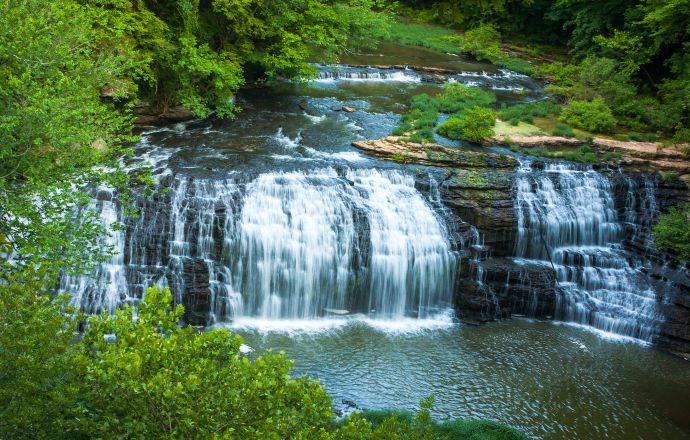 Cummins Falls is a beautiful, wide waterfall that streams over a rock ledge in several different places before cascading down -rominent rock terraces.