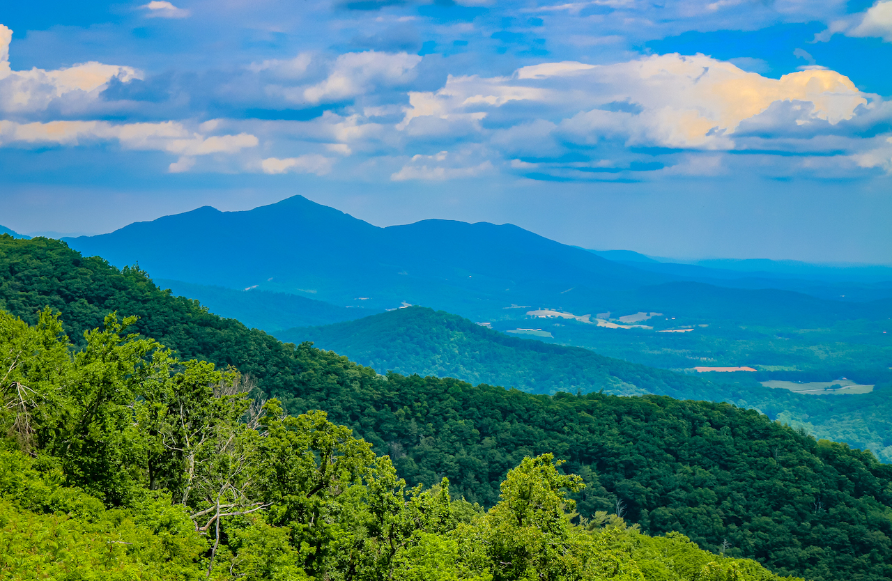 Another contender for the best scenic views on the Blue Ridge Parkway, the Devil’s Backbone Overlook provides an expansive panorama across Blackwater Valley to the distant mountains.