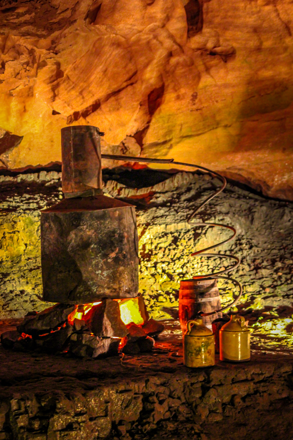 Making our way down deeper into the caverns, we saw the late-1800s graffiti, an authentic Appalachian moonshine still that was found there, a wooden vat used to cook saltpeter, and even some small waterfalls.