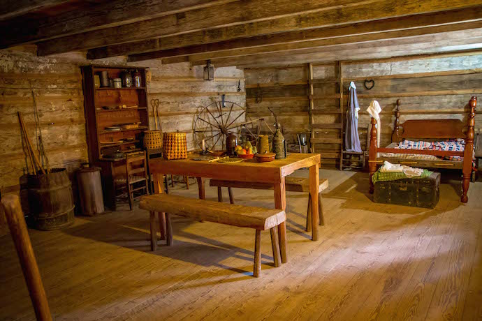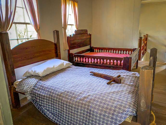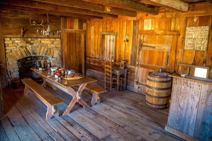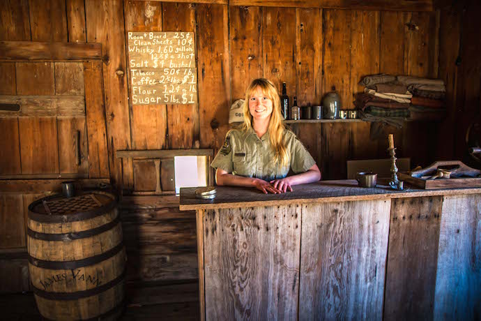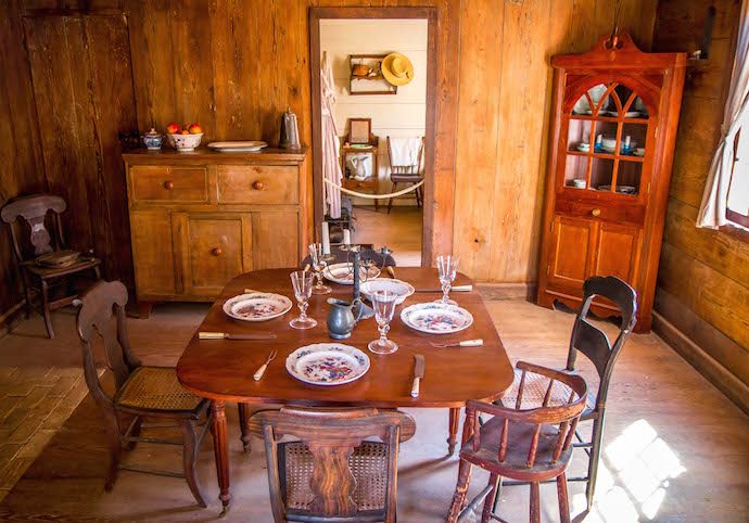 Inside you’ll find a typical tavern/inn of the era, which would have a small bar, picnic table for dining, and small rooms for rent upstairs. It’s interesting to note that a room for the night was just 50¢, while a shot of whiskey was 25¢!