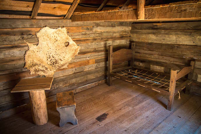 The tiny log cabin here is still very well-made. But it lacks all but the most basic amenities– a small bed, simple log-base table, stool, and an animal pelt as the only decor.