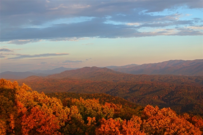 The trail to Sutton Ridge Overlook is located just outside of the Cosby Campgrounds, and it provides a wonderful vista of the Smoky Mountains fall foliage.