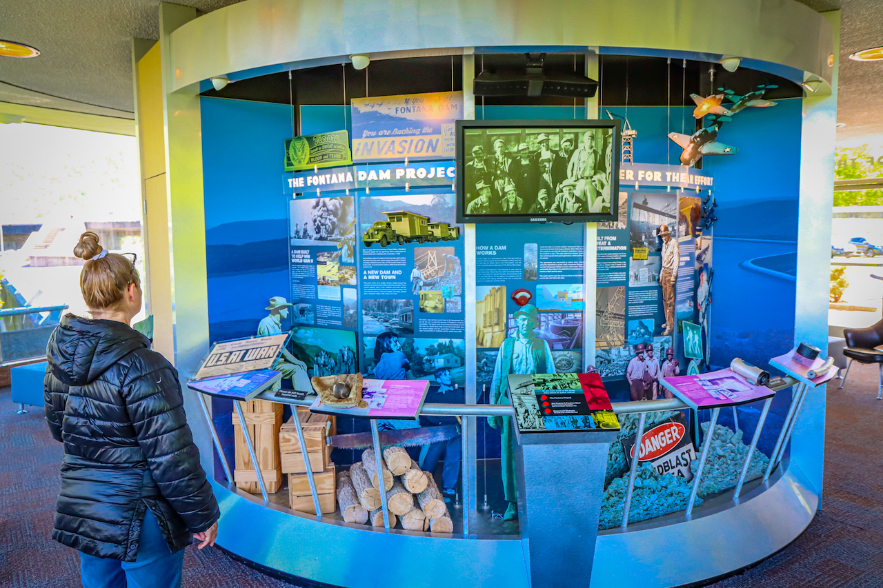 Inside the newly refurbished Visitors Center (which is run by Tennessee Valley Authority retirees), guests can view videos, maps, and exhibits with info about the history of Fontana Dam and the TVA itself.