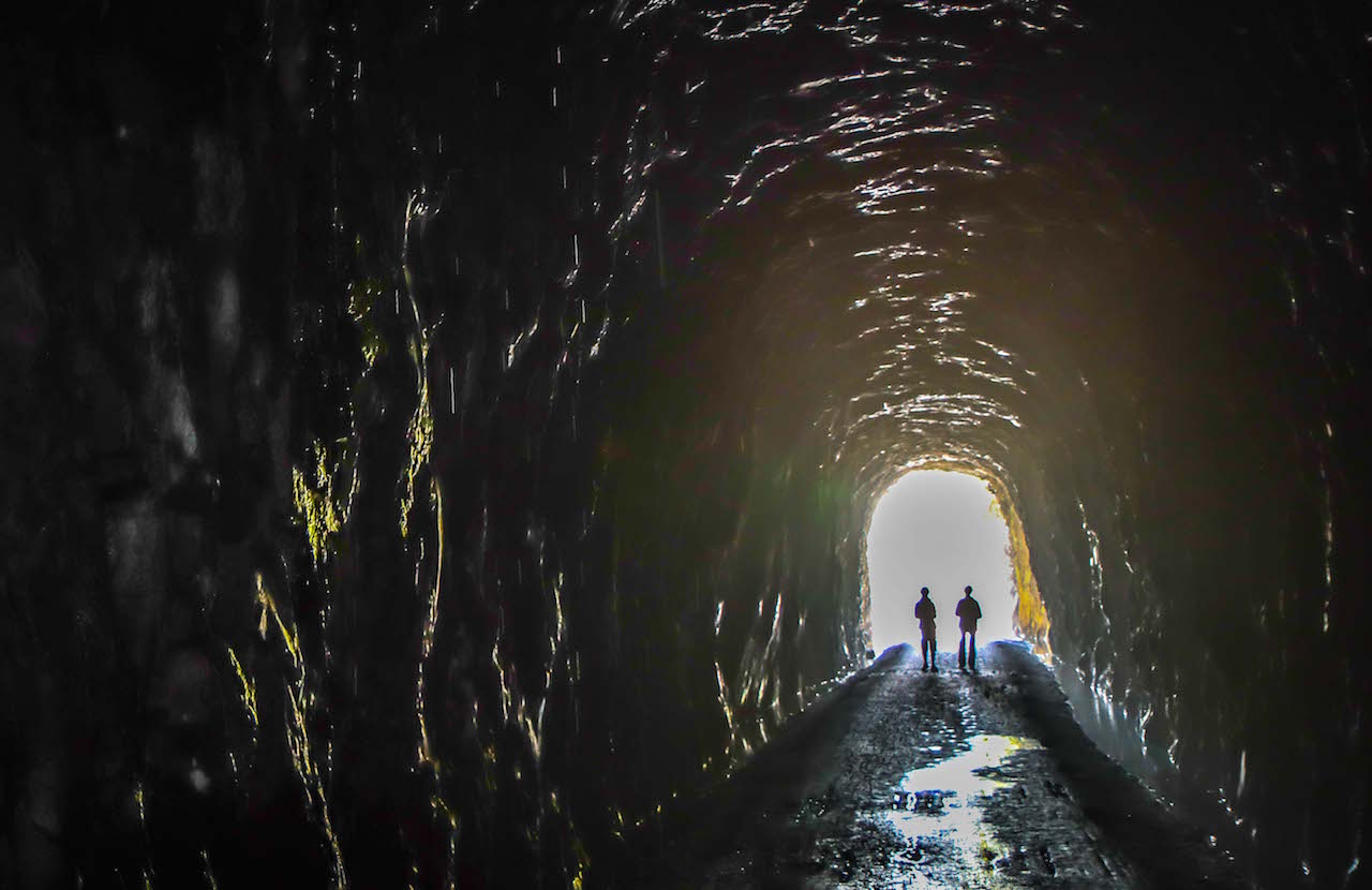 The tunnel is very dark, and at times you won’t be able to see the light at either end. We highly recommend wearing a high-powered headlamp and/or bring a flashlight so you don’t miss any of the interior magic of this special place!