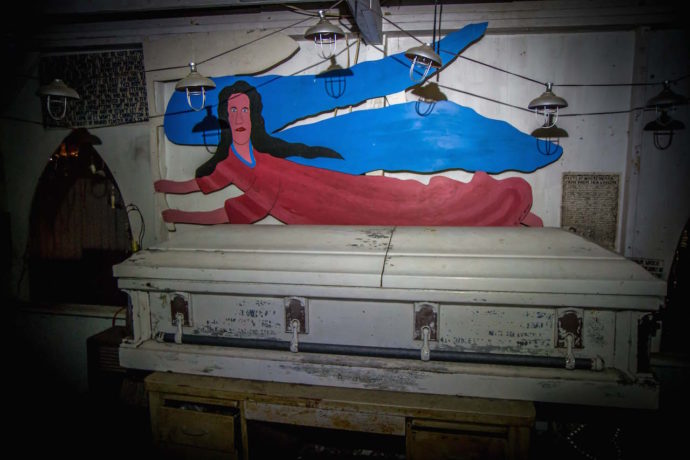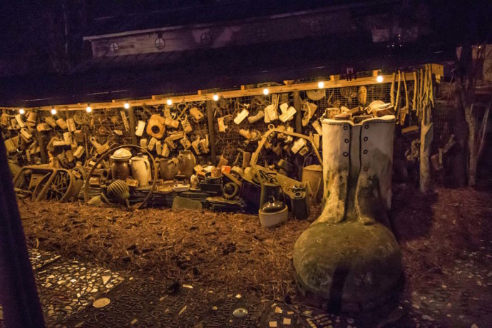 It’s also interesting what they choose NOT to light up, such as the white coffin tucked away in a dirt floor chapel, set atop a rusty old desk, with Finster’s iconic Angel painting floating above it. Our headlamp makes it look bright in the photo, but the dim lighting when we arrived made it seem downright spooky.
