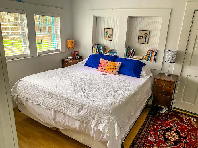 The king-sized bedroom features a luxury mattress with high quality linens. Which makes it all the more cozy to lay in bed and look at the art all around you.