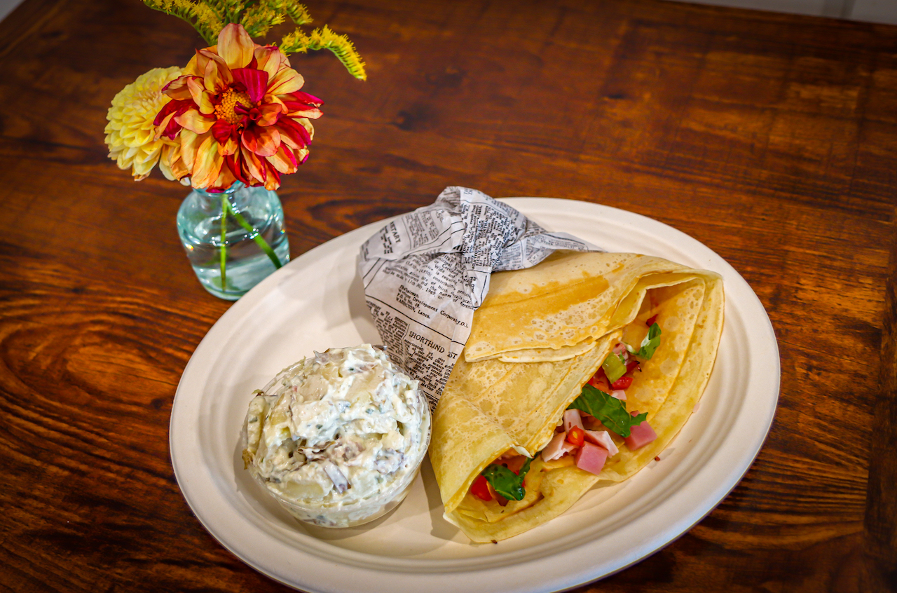 Their simple menu includes Sweet, Savory, and Breakfast Crepes, as well as salads, sides, and a Soup of the Day. Try their Monte Cristo, Beef & Cheddar Crepe, Build-Your-Own Custard option, or the decadent Nothing But Nutella Crepe!