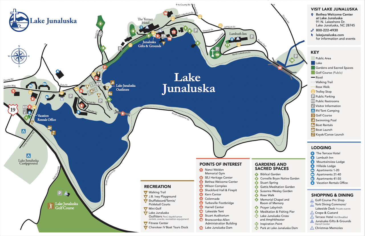 There are two Lake Junaluska hotels, campsites and cabins at the Lake Junaluska Campground, and recreation opportunities ranging from fishing and kayaking to playing a round at the Lake Junaluska Golf Course.