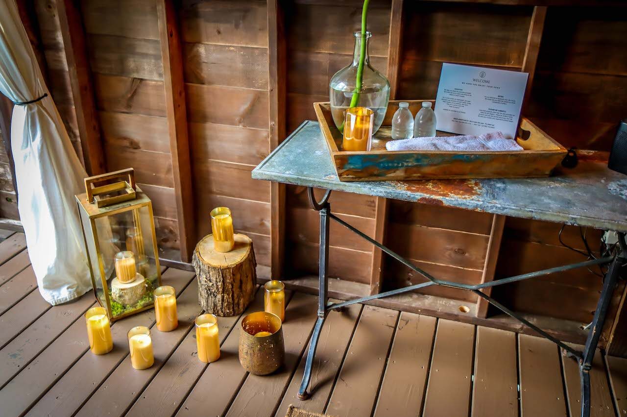 The surrounding forest and intimate setting make this an inherently romantic experience for couples, with electric candles, great-smelling bath products, plush robes, and a heater for use during cooler months.