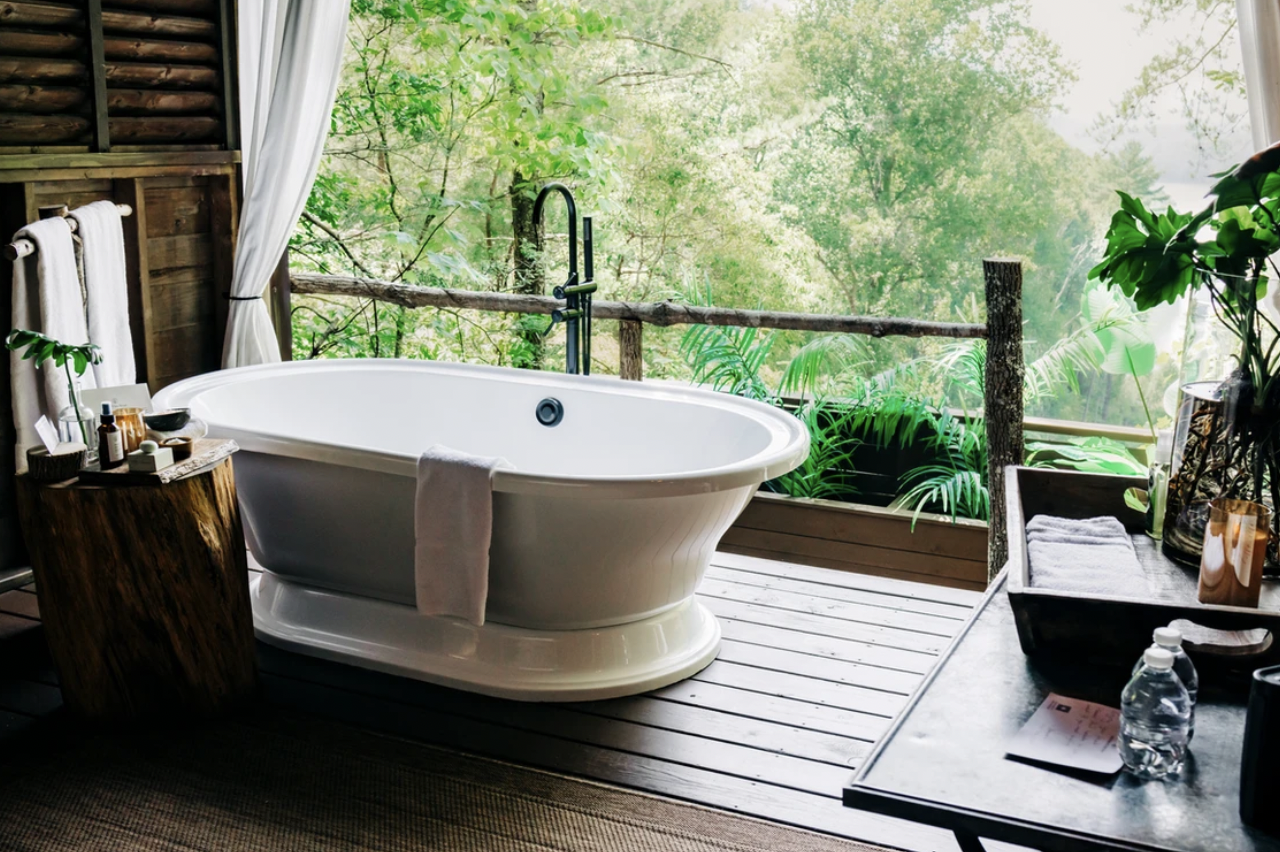 There are no tubs in any of the rooms at Lakeview at Fontana, but anyone can reserve a 90-minute slot at their treetop soaking cabanas (which are also 100% contact-free for ultimate privacy).