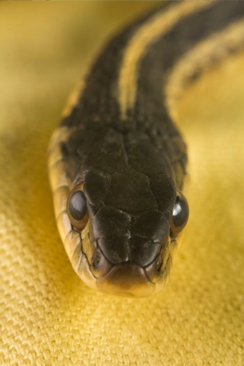 These snakes tend to have varied coloration, with some exhibiting a checkered pattern. But they are easily identified by a prominent yellow stripe running down the middle of a darker body.