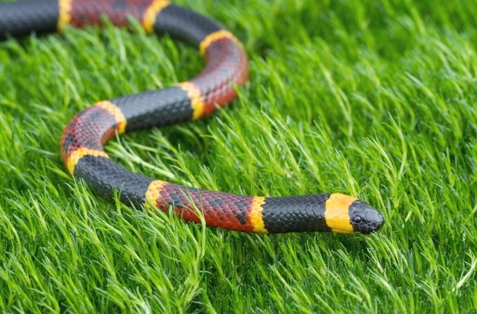 Unlike most venomous snakes, coral snakes tend to be thin. They have red, yellow, and black bands, with thin yellow bands separating the thicker red and black bands.
