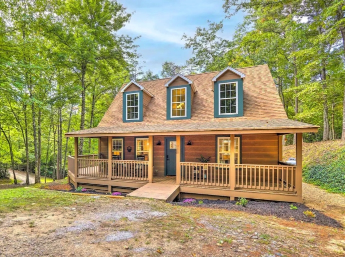 This pet-friendly Blairsville Cabin Rental has a firepit with swing, ping pong table, grill, washer and dryer, and large porch. Relaxation is a big part of this rental, which offers R&R and a lovely break from the fast-paced world.