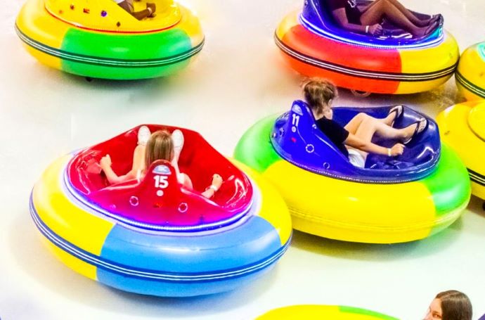Using a neon-colored Ice Bumper Car (shaped like an inner tube, with video game-like controls), guests can smash, bump, or simply spin their way around the huge rink, which they share with skaters.