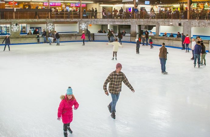 The skating rink is designed for all skill levels. There’s a handrail around the rink to aid beginners, while experienced skaters have plenty of open space to spin and jump to their heart’s content.