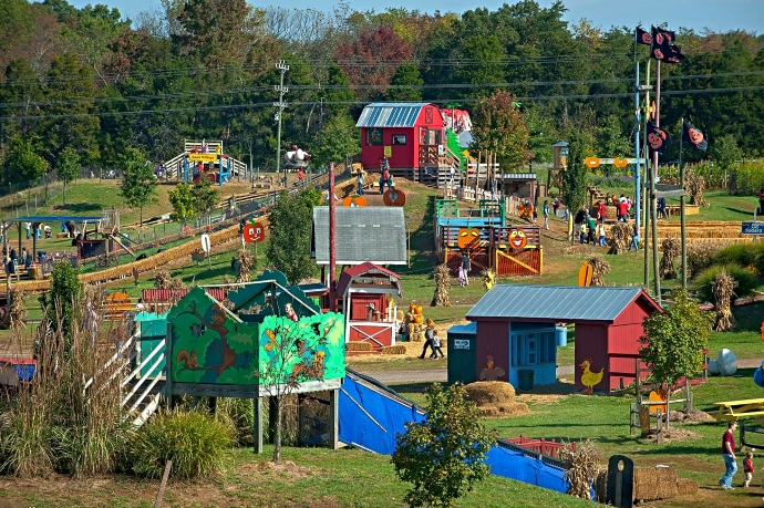 There are lots of kid-friendly activities at the Centreville farm, including epic hayrides, treetop slides, straw tunnels, a tractor museum, and a live music stage.
