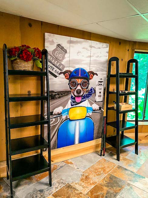 The game room was easily our favorite room of our Helen vacation rental, and not just because we adored the awesome floor-to-ceiling painting of a dog riding a moped!