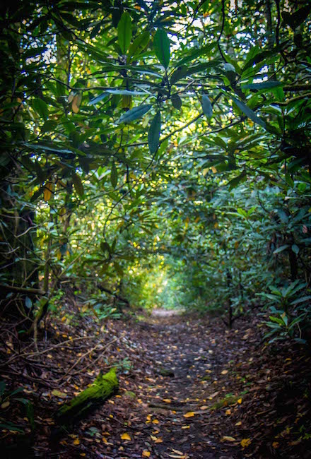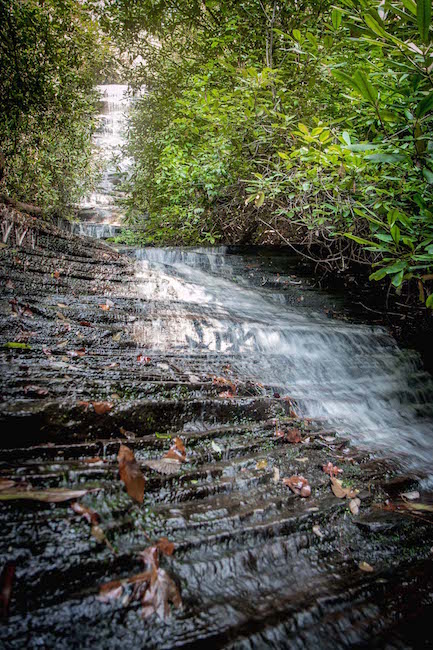 Following Joe Creek .6-miles through a forest filled with rhododendron and old growth hardwoods, you’ll reach the impressive Panther Falls first.