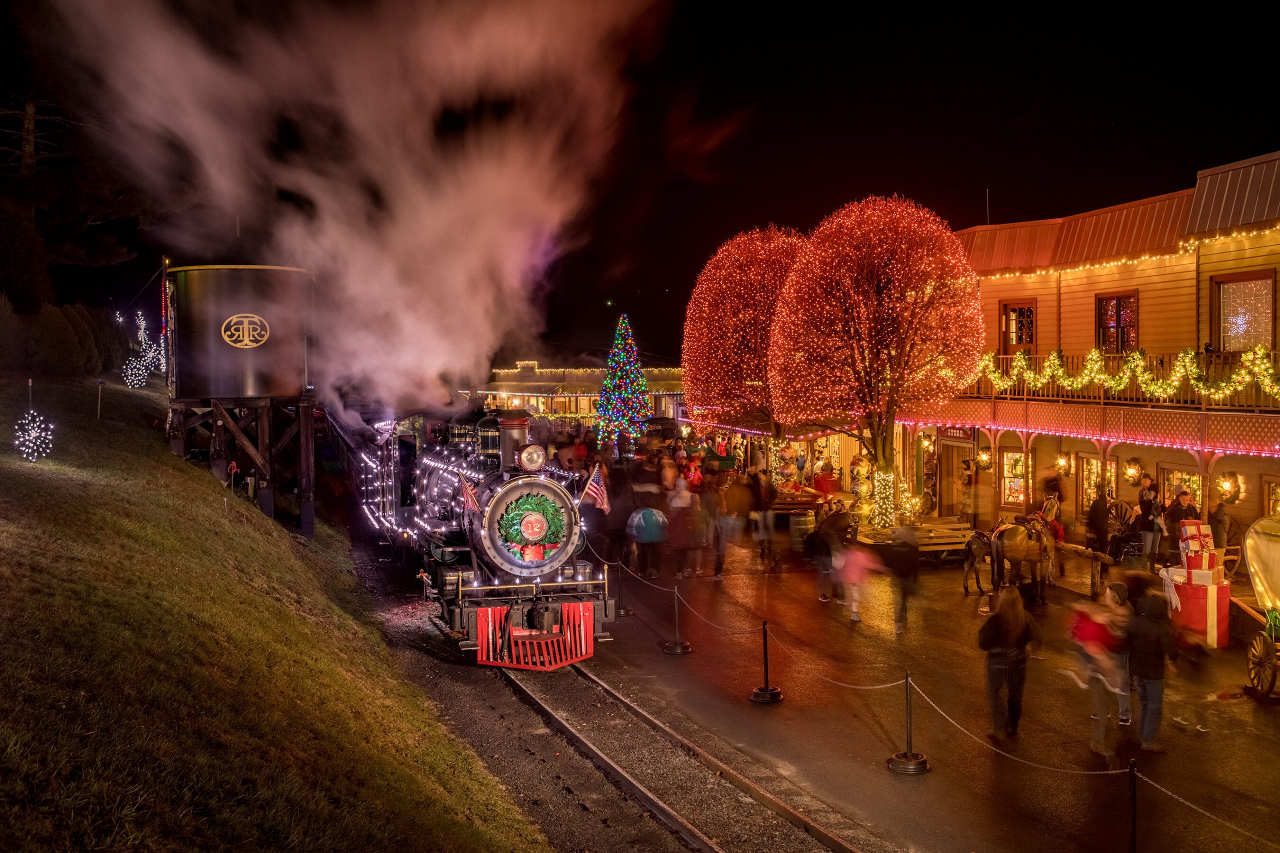 Tweetsie Railroad operates two historic narrow-gauge Christmas steam trains: No. 12 is from East Tennessee and North Carolina, and once ran between Johnson City and Boone, while No. 190 is from Alaska’s White Pass and Yukon’s Railway.