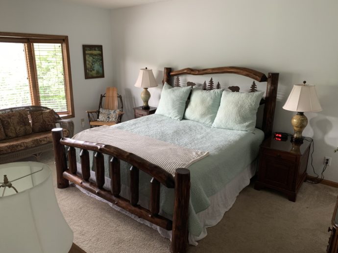 The wood floors and tables, stone fireplace, carved wooden bears on the bed and lamps, and bison wall art reflected the natural beauty that surrounds the property, and which defines the NC High Country as a whole.