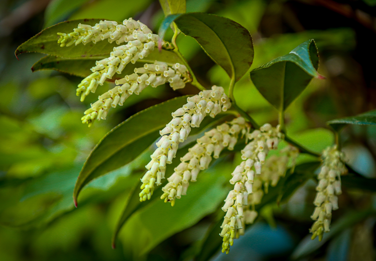 Their new growth foliage is often red and fragrant, with creamy white flower clusters drooping downward from the underside of the branches.